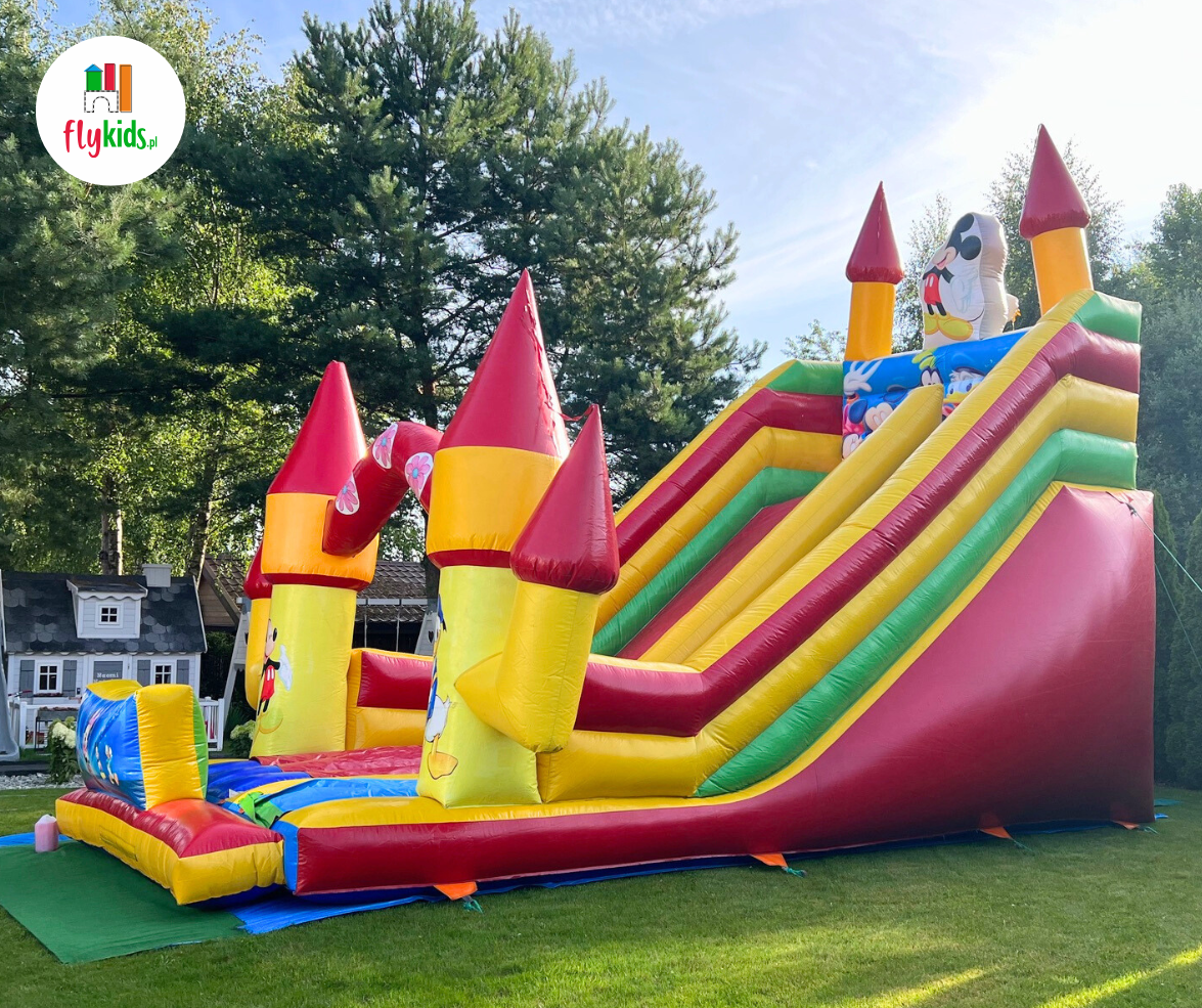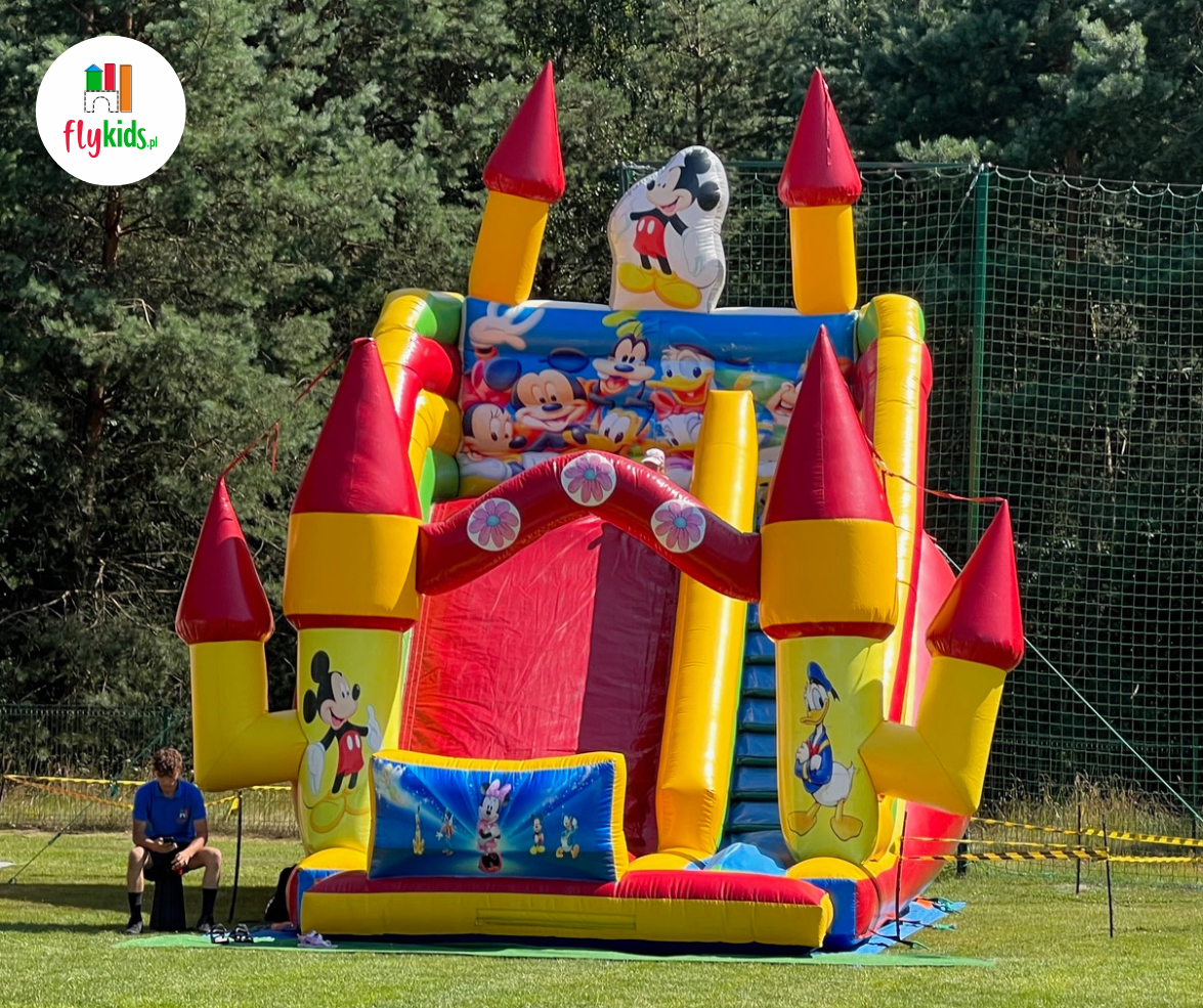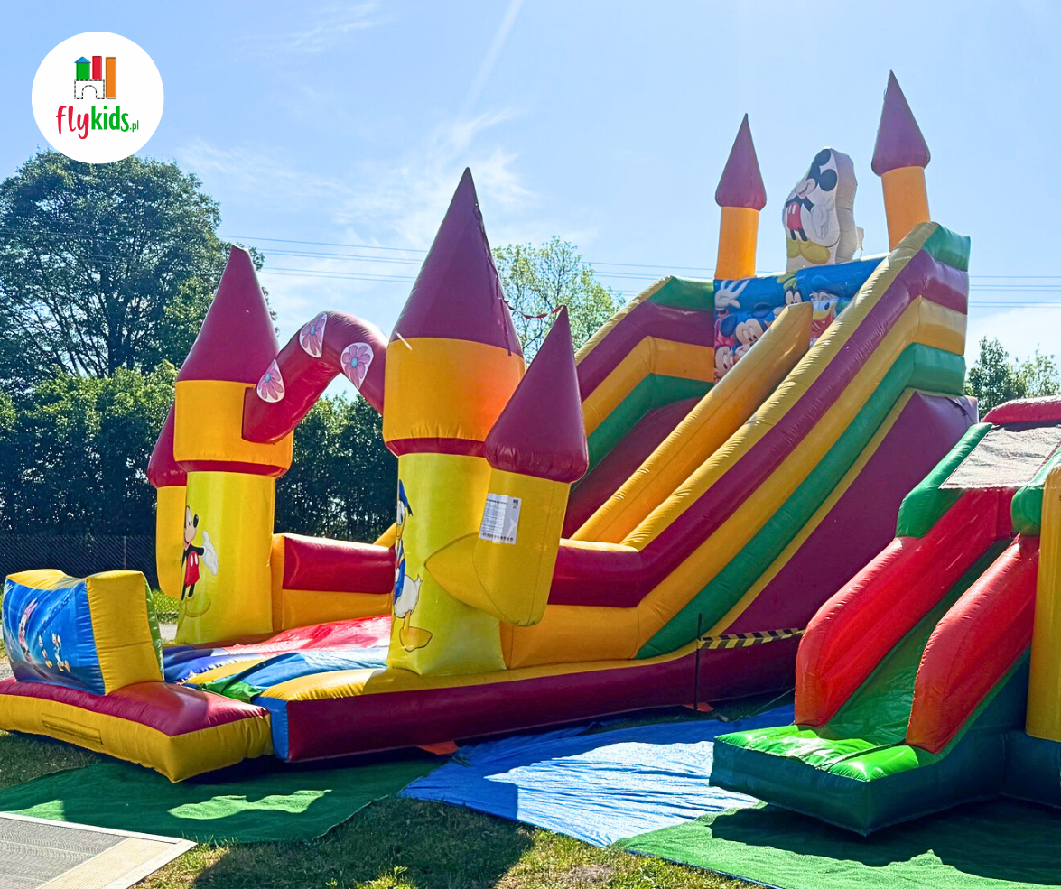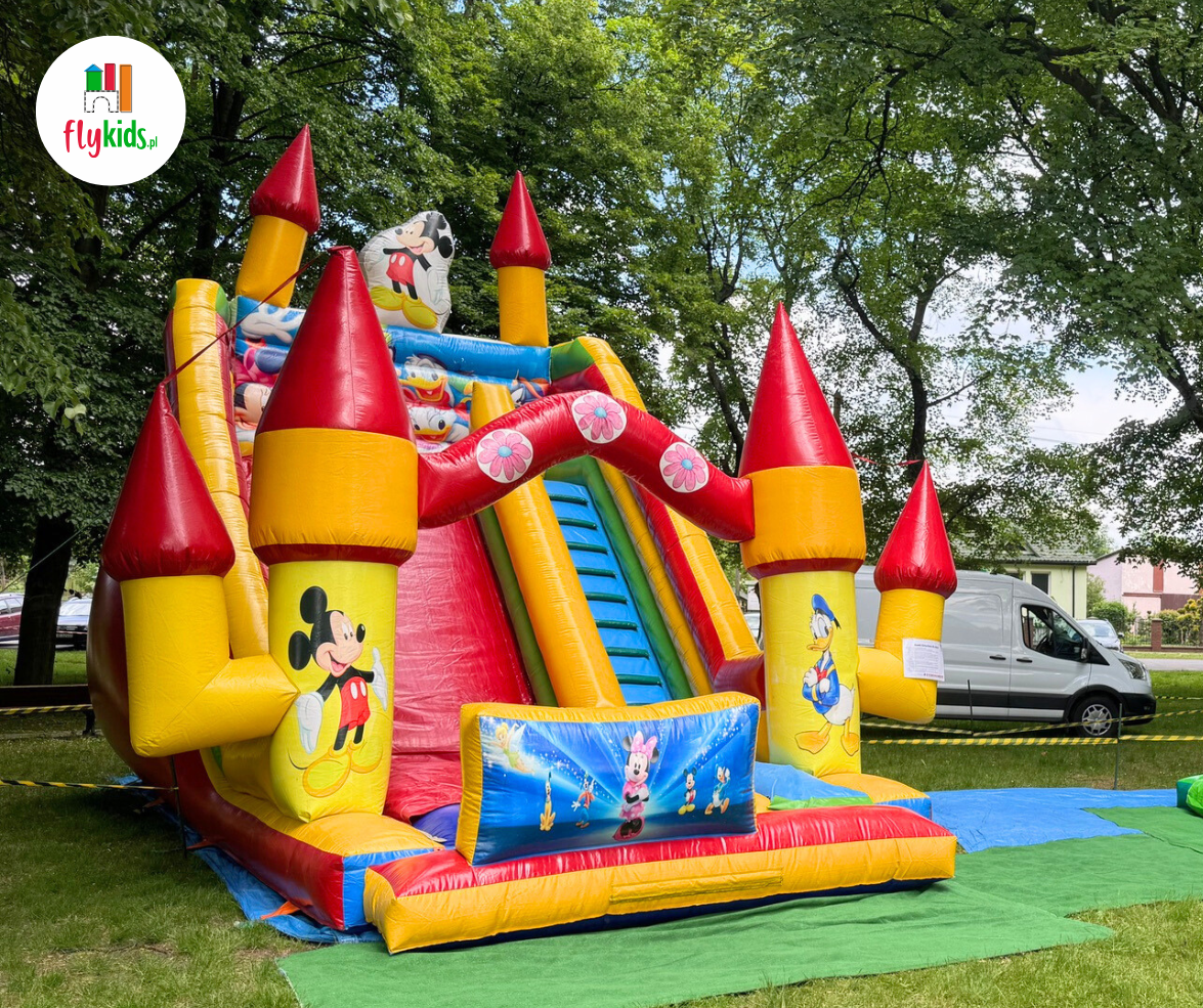 MEGA Miki & Donald to ogromny, kolorowy dmuchaniec ze zjeżdżalnią, ozdobiony wizerunkami uwielbianych bajkowych postaci.