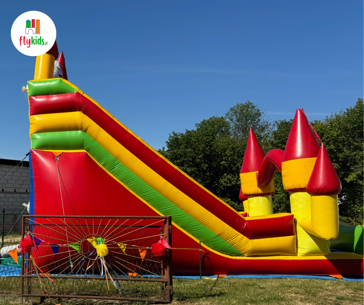 Przestronna konstrukcja, wysoka zjeżdżalnia i piękne grafiki sprawiają, że to jedna z największych atrakcji na urodziny, komunie, pikniki rodzinne oraz duże eventy plenerowe.