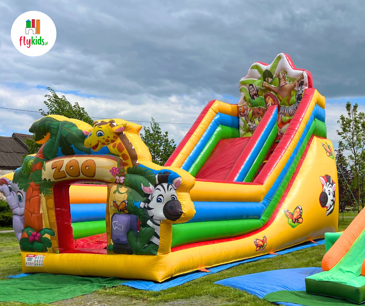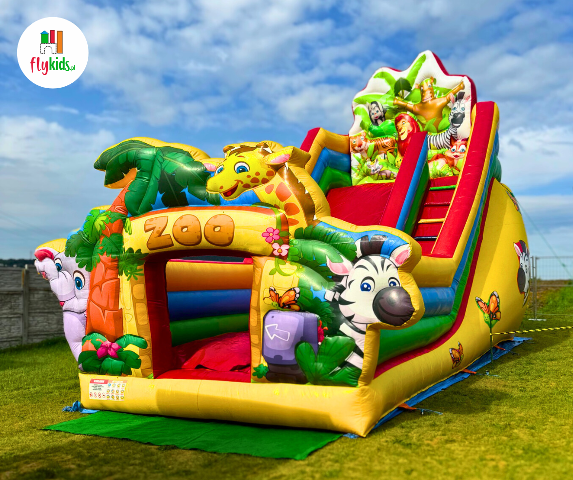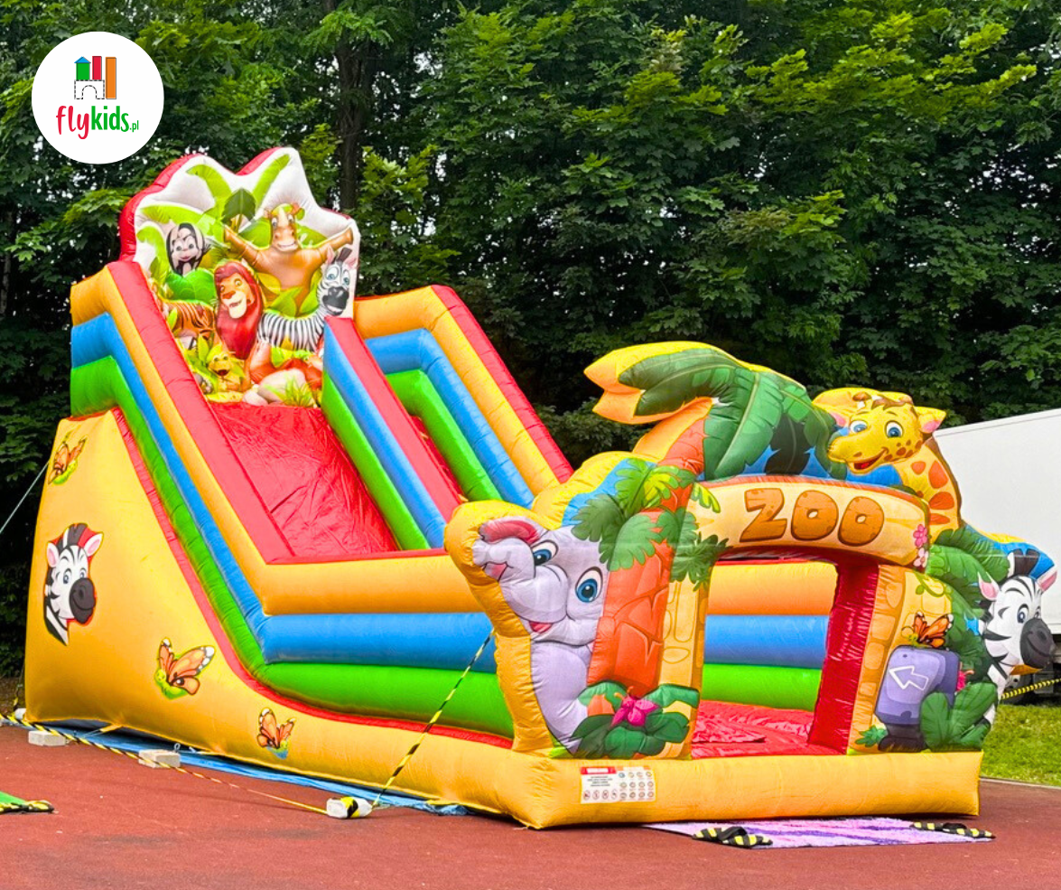 MEGA Zoo to kolorowy, efektowny dmuchaniec ze zjeżdżalnią i motywami zwierzątek z dżungli. Ogromna przestrzeń do zabawy, długi ślizg i bezpieczne strefy sprawiają, że to idealna atrakcja na duże imprezy rodzinne, komunie, festyny i eventy plenerowe.