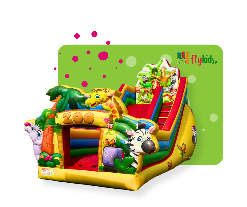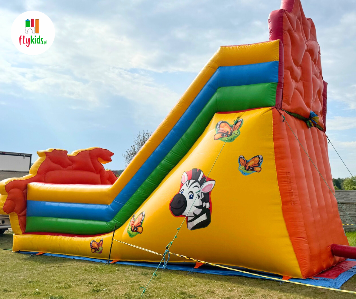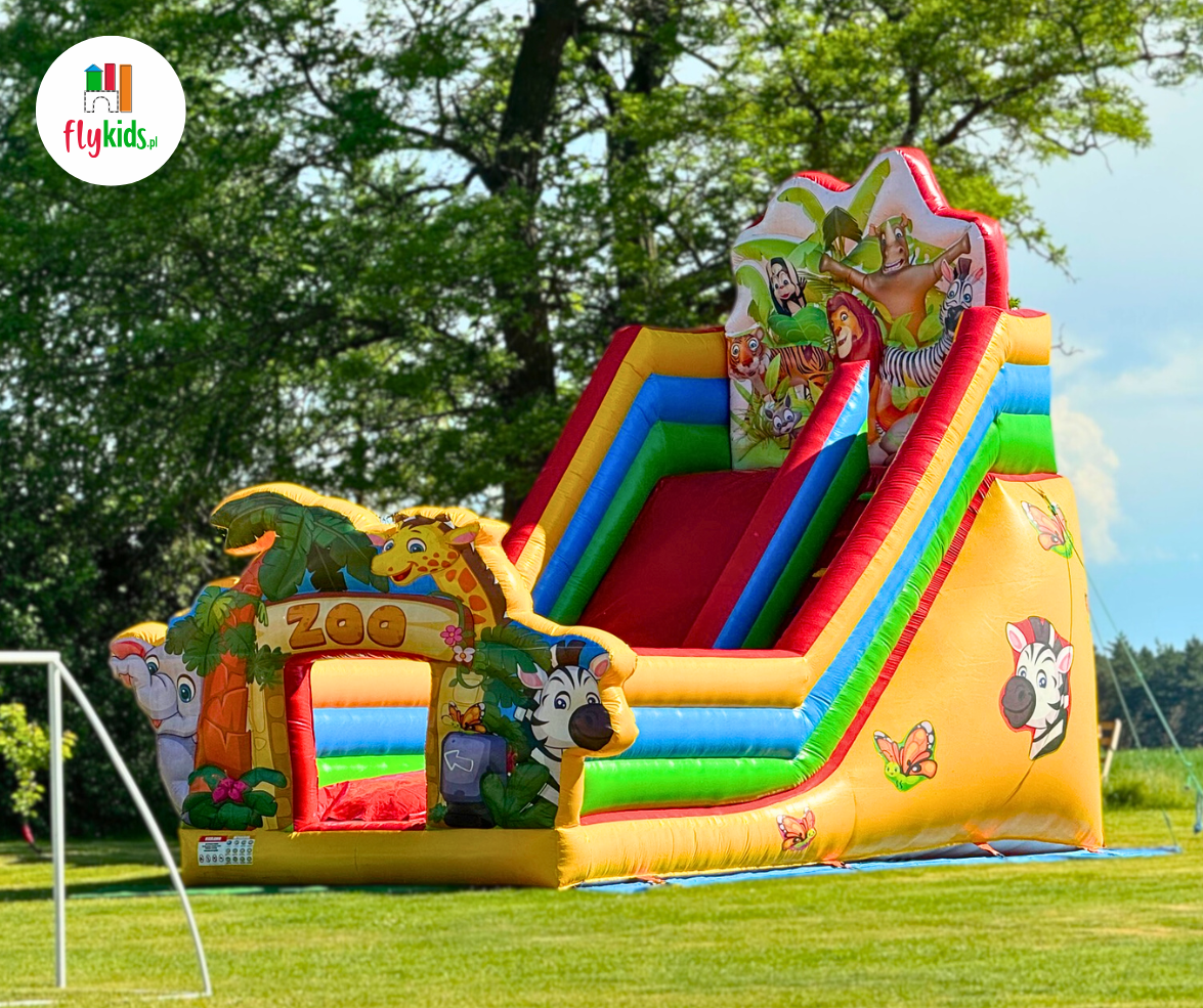 MEGA Zoo to kolorowy, efektowny dmuchaniec ze zjeżdżalnią i motywami zwierzątek z dżungli. Ogromna przestrzeń do zabawy, długi ślizg i bezpieczne strefy sprawiają, że to idealna atrakcja na duże imprezy rodzinne, komunie, festyny i eventy plenerowe.