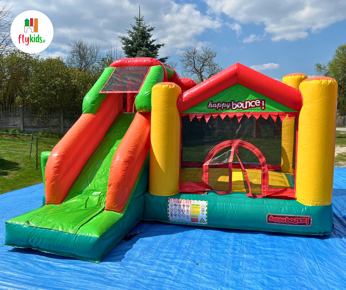 Łączy w sobie bezpieczną trampolinę, mini ściankę wspinaczkową i szeroką zjeżdżalnię, zapewniając dzieciom mnóstwo emocji i ruchu.